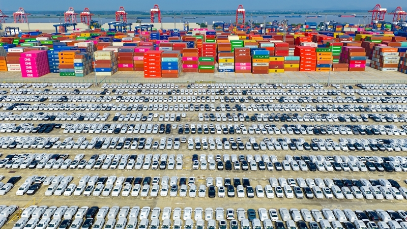 2025年10月4日在江苏省港口华球南京港龙潭港区拍摄的准备装船出口的汽车(无人机照片)。新华社发(杨素平 摄)